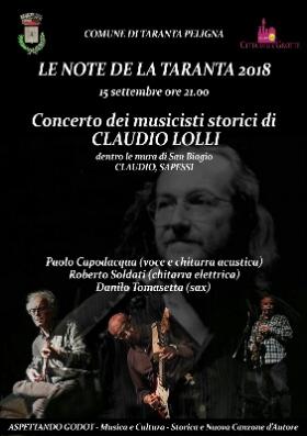Torna il 15 settembre, nello splendido borgo di Taranta Peligna, la manifestazione "Le Note de la Taranta". Con inizio alle ore 21, all'interno delle Mura di san Biagio, la serata sarà allietata dai musicisti storici di Claudio Lolli: Paolo Capodacqua (chitarra acustica), Danilo Tomasetta (Sax) e Roberto Soldati (chitarra elettrica).